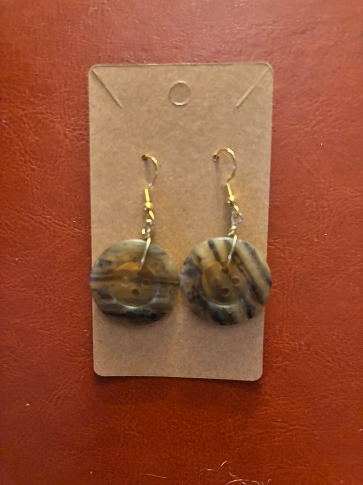 Enter Aubrey’s World of Steampunk jewelry and share her love of antique buttons. Light tan with stripes with gold hooks. Can be worn with casual or dress attire. One of a kind peoce as unique as you!