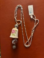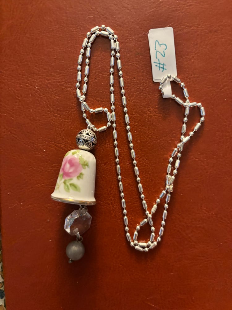 Enter Aubrey’s World of Steampunk jewelry. Made from repurposed parts this stunning necklace complete with chain that is 18 in. Small crystal from chandlier with glass thimble. Can be worn with casual or dress attire. One of a kind piece as unique as you!