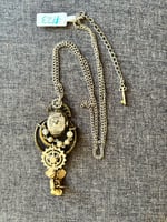 Enter Aubrey’s World of Steampunk jewelry. Made from repurposed parts this necklace complete with chain that is 15 in with extender and key charm. Antique watch face and rosary beads. Can be worn with casual or dress attire. One of a kind piece as unique as you!